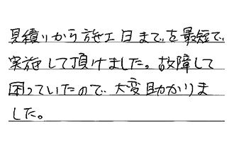 見積りから施工日までを最短で実施して頂けました。故障して困っていたので、大変助かりました。