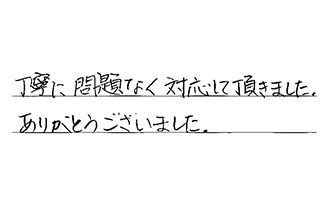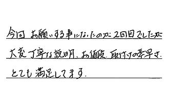 今回、お願いする事になったのが2回目でしたが、大変丁寧な説明、お値段、取付けの素早さ、とても満足してます。