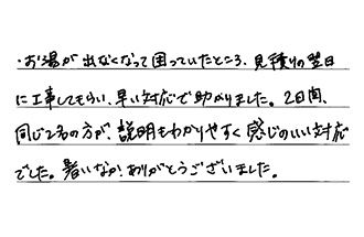 お湯が出なくなって困っていたところ、見積りの翌日に工事してもらい、早い対応で助かりました。2日間、同じ2名の方が、説明もわかりやすく、感じのいい対応でした。暑いなか、ありがとうございました。