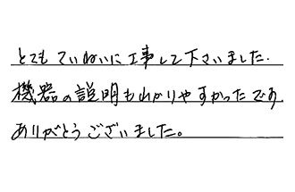とてもていねいに工事して下さいました。機器の説明もわかりやすかったです。ありがとうございました。