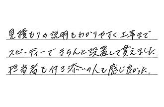 見積もりの説明もわかりやすく、工事までスピーディーで、きちんと設置して貰えました。担当者も付き添いの人も感じ良かった。