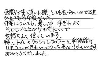 見積りで来て頂いた際、とても気づかいができる点が、とても好印象でした。作業についても、暑い中、手ぎわよく、そして仕上がりもきれいで、気持ちよく使っています。特にトイレのクッションフロアーと給湯器のリモコンがきれいになった事がうれしいです。ありがとうございました。