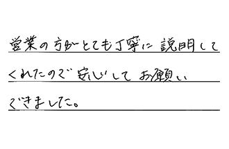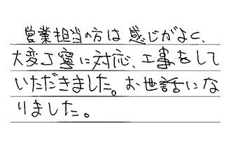 営業担当の方は感じがよく、大変丁寧に対応・工事をしていただきました。お世話になりました。