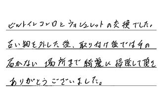 ビルトインコンロとウォシュレットの交換でした。古い物を外した後、取り付け後では手の届かない場所まで、綺麗に掃除して頂き、ありがとうございました。