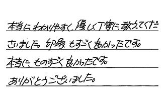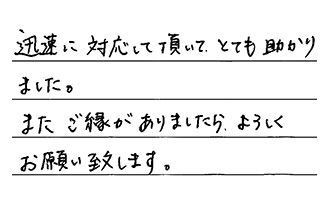 とても暑い中、本当によくしていただきました。いままでいろいろな業者の方にたのんでいましたが、その中で一番早くていねいでした。