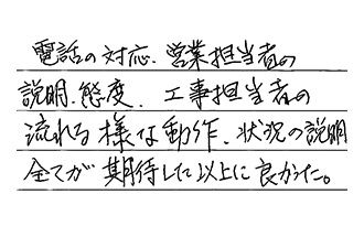 電話の対応、営業担当者の説明・態度、工事担当者の流れる様な動作・状況の説明、全てが期待した以上に良かった。