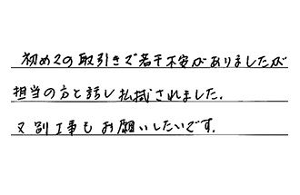 初めての取引きで、若干不安がありましたが、担当の方と話し、払拭されました。又、別工事もお願いしたいです。