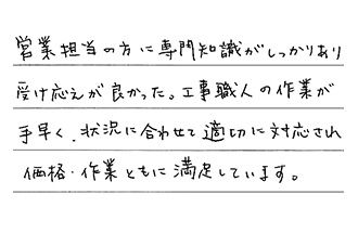 営業担当の方に専門知識がしっかりあり、受け応えが良かった。工事職人の作業が手早く、状況に合わせて適切に対応され、価格・作業ともに満足しています。