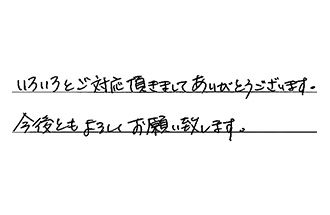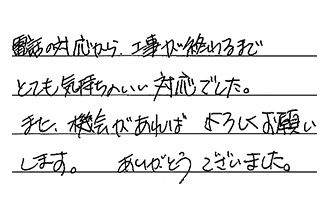 電話の対応から、工事が終わるまで、とても気持ちのいい対応でした。また、機会があれば、よろしくお願いします。ありがとうございました。