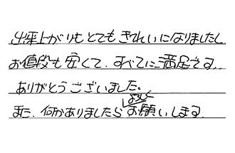 出来上がりもとてもきれいになりましたし、お値段も安くて、すべてに満足です。ありがとうございました。また、何かありましたら、よろしくお願いします。