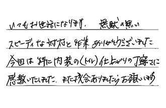 いつもお世話になります。無駄の無いスピーディな対応と作業、ありがとうございました。今回は特に、内装の(トイレ)仕上がりの丁寧さに感激いたしました。また機会がありましたら、お願いします。