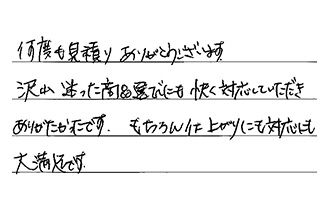 何度も見積りありがとうございます。沢山迷った商品選びにも、快く対応していただき、ありがたかったです。もちろん仕上がりにも対応にも大満足です。