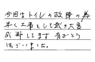 今回はトイレの故障の為、早く工事をして戴き、大変感謝してます。有がとう御ざいました。