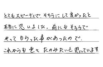 とてもスピーディーで、そちらにして良かったと本当に思いました。前にもそちらでやってもらった事があったので、これからも色々たのみたいと思っています。