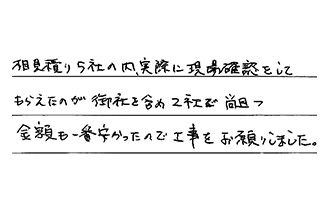 相見積り5社の内、実際に現場確認をしてもらえたのが、御社を含め2社で、尚且つ金額も一番安かったので、工事をお願いしました。