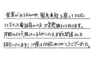 この冬の寒い時期、お風呂に入れない不自由さの中、早急に対処して頂き、感謝しております。ありがとうございました。また何かありましたら、助けて下さい。よろしくお願いします。