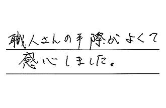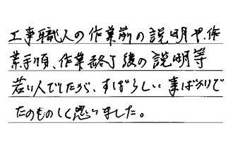 工事職人の作業前の説明や作業手順、作業終了後の説明等、若い人でしたが、すばらしい事ばかりで、たのもしく思いました。