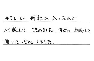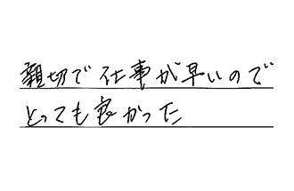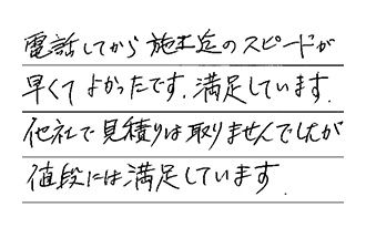 電話してから施工迄のスピードが早くてよかったです。満足しています。他社で見積りは取りませんでしたが、値段には満足しています。