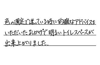 色の選定で迷っている時に的確なアドバイスをいただいたおかげで、明るいトイレスペースが出来上がりました。