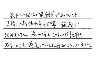 ネットだけでなく実店舗があったこと、見積りに来てくれた方の印象、値段で決めました。施工時もていねいな説明もあり、とても満足しています。ありがとうございました。