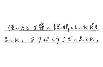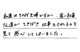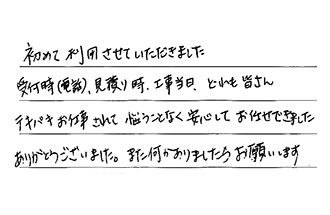 初めて利用させていただきました。受付時(電話)、見積り時、工事当日、どれも皆さんテキパキお仕事されて、悩むことなく安心してお任せできました。ありがとうございました。また何かありましたら、お願いします。