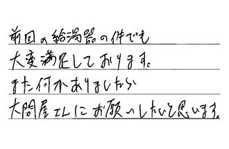 前回の給湯器の件でも、大変満足しております。また何かありましたら、大問屋さんにお願いしたいと思います。