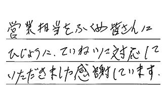 対応がとても丁寧でした。相見積もり店を批判せず、理論的に説明され、社内のスタッフも洗練され、とても感じ良かった。礼儀正しい方々でした。