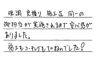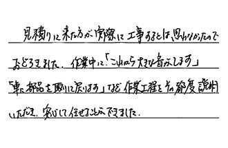 見積りに来た方が実際に工事するとは思わなかったので、おどろきました。作業中に「これから大きな音がします」「車に部品を取りに戻ります」など、作業工程をその都度説明いただき、安心して任せることができました。