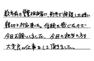 数年前の営業担当者に、別件で相談した時に、親切に対応頂いた。信頼を感じたので、今回お願いしました。今回の担当の方も、大変良い仕事をして頂きました。