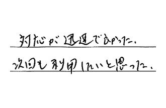 ①頼んでからすぐ(2日後)対応してくれて、本当に助かりました。②今後も必要なときは、御社に頼もうかと思っております。
