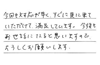 今回も対応が早く、すぐに見に来ていただけて、満足しています。今後もお世話になると思いますので、よろしくお願いします。