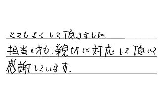 とてもよくして頂きました。担当の方も親切に対応して頂いて、感謝しています。
