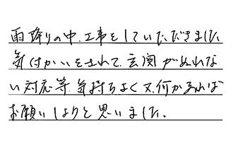 雨降りの中、工事をしていただきました。気遣いをされて、玄関がぬれない対応等、気持ちよく、また、何かあれば、お願いしようと思いました。