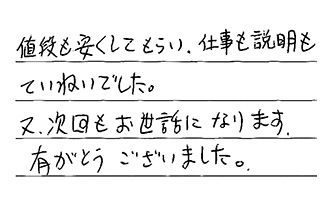 値段も安くしてもらい、仕事も説明もていねいでした。又、次回もお世話になります。有りがとうございました。