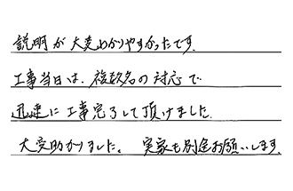 電話から、下見の訪問・見積り・施工まで、スピーディで、対応もとても親切でした。ありがとうございました。