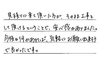 見積りに来て頂いた方が、そのまま工事をして頂けるということで、安心感がありました。今後も何かあれば、気軽にお願い出来そうで、良かったです。