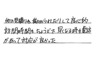 他の見積りも勧められたりして良心的。訪問時間もちょうどで、早くなる時も電話があって、対応が良かった。