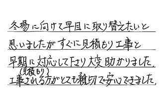 冬場に向けて、早目に取り替えたいと思いましたが、すぐに見積もり工事と、早期に見積もり対応して下さり、大変助かりました。工事される方がとても親切で、安心できました。
