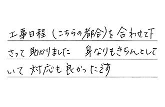 今回、初めてお願いしたのですが、とても良くお話しして頂き、又、工事もスムーズで、とても満足しました。ありがとうございました。