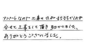 アパートなので、工事の日がまちまちでしたが、合わせて工事をして頂き、助かりました。ありがとうございました。