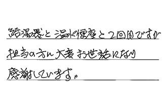 ガス給湯器を取り付けて頂きました。こちらの都合で、指定日にやってもらい、とても助かりました。手際もよく丁寧でした。有り難うございました。