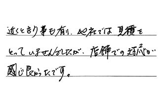 近くと言う事も有り、他社では見積をとっていませんでしたが、店舗での対応が感じ良かったです。