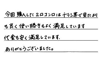 今回購入した2口コンロは、チラシ等で見たよりも良く、使い勝手もよく、満足しています。代金も安く、満足しています。ありがとうございました。