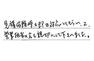 見積依頼時も即日対応してもらい、又、営業担当の方も、親切にして下さいました。