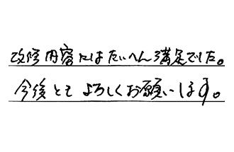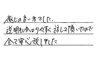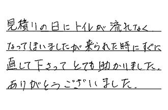 見積りの日にトイレが流れなくなってしまいましたが、来られた時にすぐに直して下さって、とても助かりました。ありがとうございました。