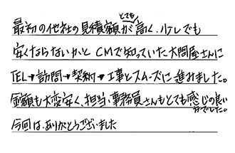 最初の他社の見積額がとても高く、少しでも安くならないかと、CMで知っていた大問屋さんにTEL→訪問→契約→工事とスムーズに進みました。金額も大変安く、担当・事務員さんも、とても感じの良い方でした。っ今回は、ありがとうございました。