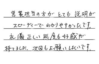 営業担当の方が、とても説明がスピーディーでわかりやすかったです。礼儀正しい態度も好感が持てました。次回もお願いしたいです。