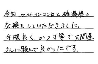 今回、ビルトインコンロと給湯器の交換をしていただきました。手際良く、かつ丁寧で、大問屋さんに頼んで良かったです。