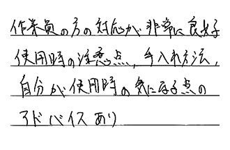 作業員の方の対応が非常に良好。使用時の注意点、手入れ方法、自分が使用時の気になる点のアドバイスあり。