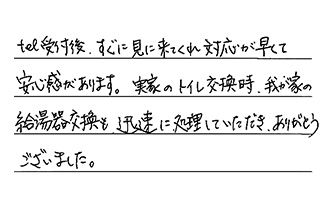 tel受付後、すぐに見に来てくれ、対応が早くて安心感があります。実家のトイレ交換時、我が家の給湯器交換も、迅速に処理していただき、ありがとうございました。